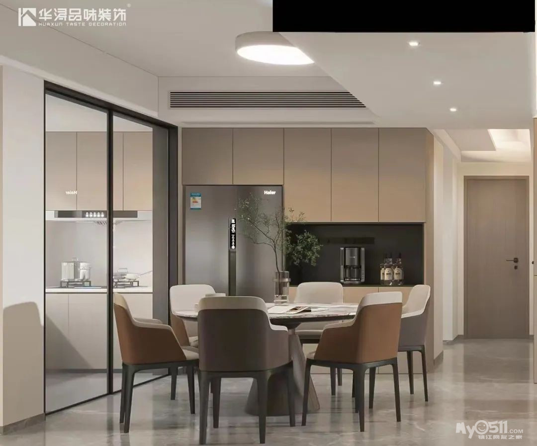 餐边柜一体化嵌入式设计,中部开放做展示区,用以摆放餐厅杂物和小型家电。岩板餐桌搭配皮质餐椅,占据餐厅C位。