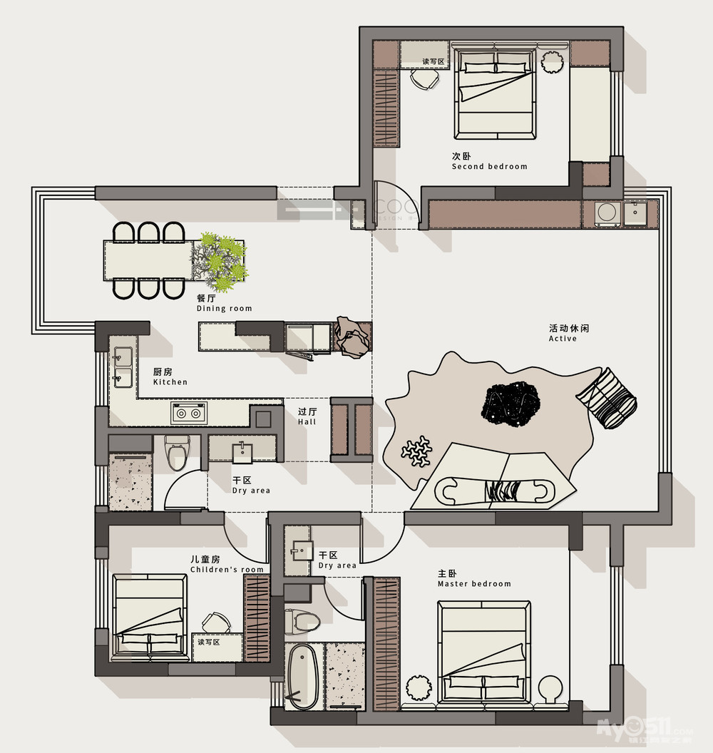 舍去次卧暗卫,增加使用空间;压缩原有过道空间,将客厅整体南移,增加展示空间和储物空间,形成小的洄游动线,增强空间趣味性。