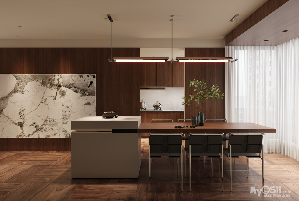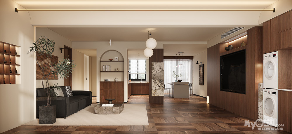 拆除原有厨房部分墙体,打开厨房空间,结合承重墙形成电器柜,增加厨房空间的同时形成玄关背景,提升隐私性并增强空间动线;