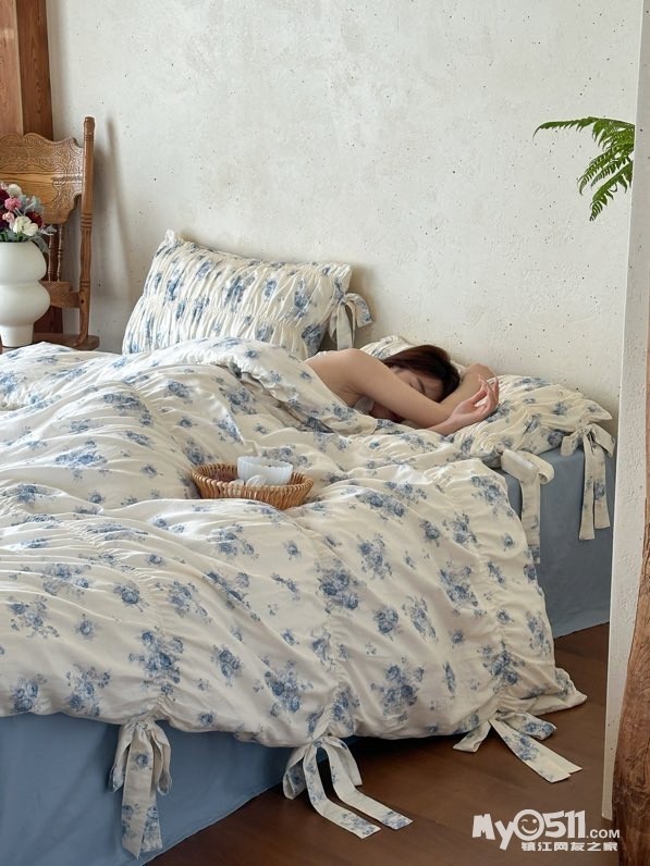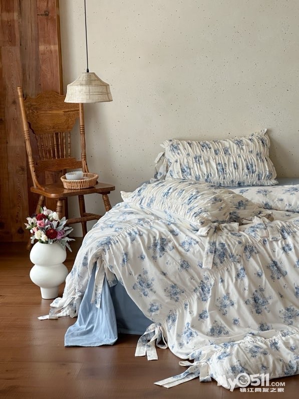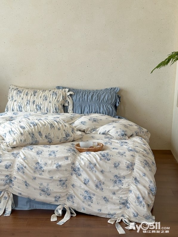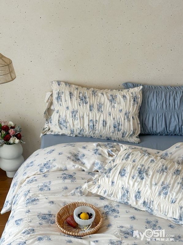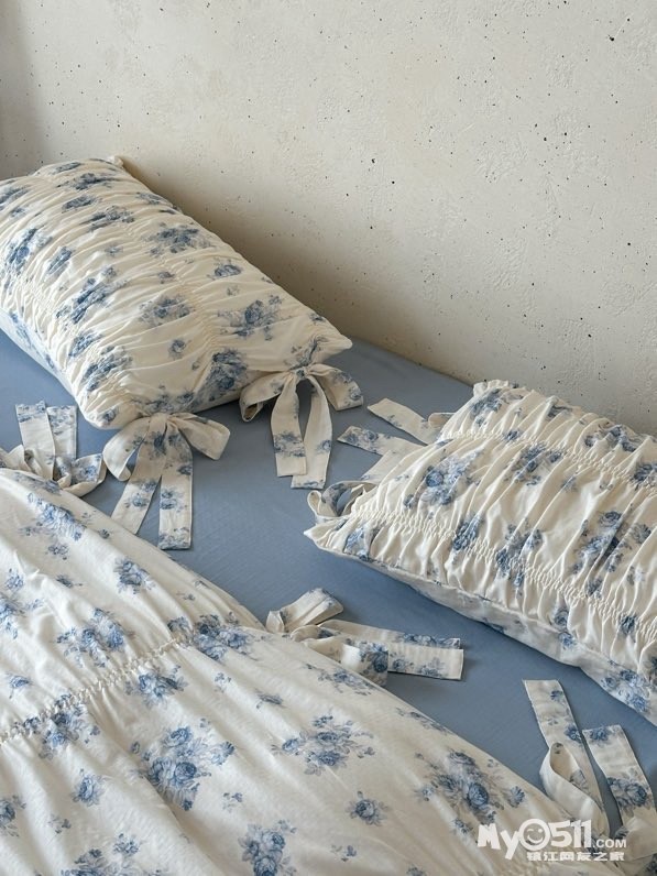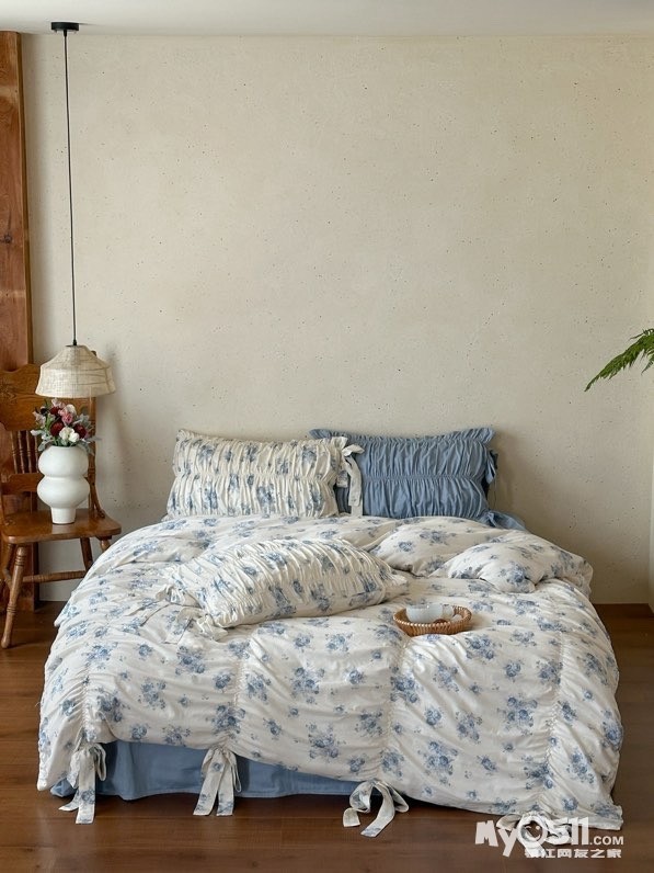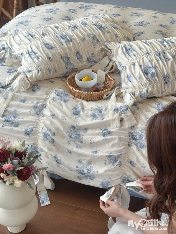 除了印花设计,床品加入了法式复古的抽褶设计和蝴蝶结系带设计,增加了面料的立体感和柔美感细节感拉满,铺在卧室瞬间拉高房间的质感