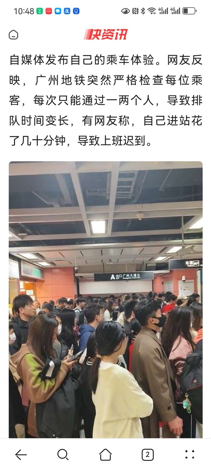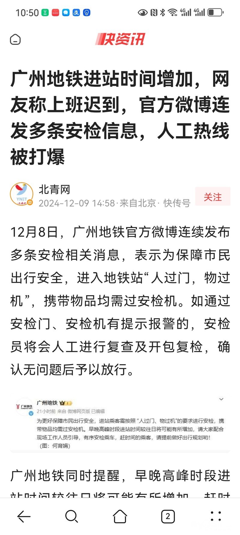 广州地铁进站时间增加,网友称上班迟到,官方微博连发多条安检信息,人工热线被打爆!