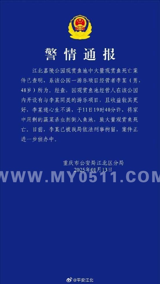 » 公园大量观赏鱼死亡,案情查清!重庆警方:投毒者已刑拘