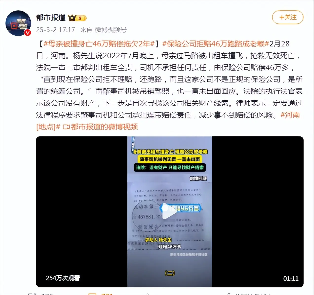 » 母亲被撞身亡46万赔偿拖欠2年!保险公司跑路成老赖