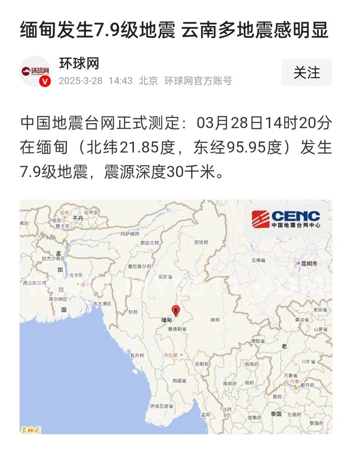» 老缅7.9级地震,震源深度达30公里!!!