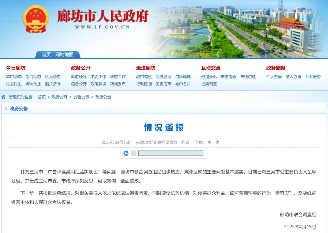 针对三河市“广告牌匾禁用红蓝黑底色”等问题,廊坊市联合调查组经初步核查,媒体反映的主要问题基本属实。目前已对三河市委主要负责人免职处理,并责成三河市委、市政府深刻反思,汲取教训,全面整改。