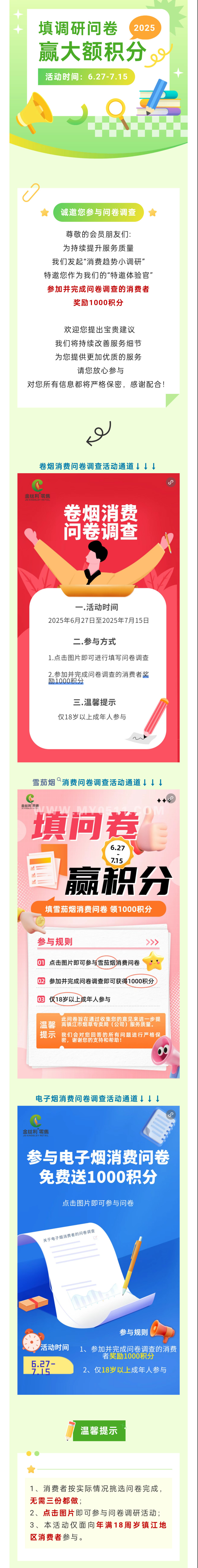 填问卷赢积分,这样的薅羊毛福利活动,不会还不知道吧?大家可以关注“镇江金丝利”公众号,进入会员商城即可参与问卷调研活动,参加并完成问卷填写的,可以领取1000积分!活动到7月15号截止,赶紧行动起来吧~