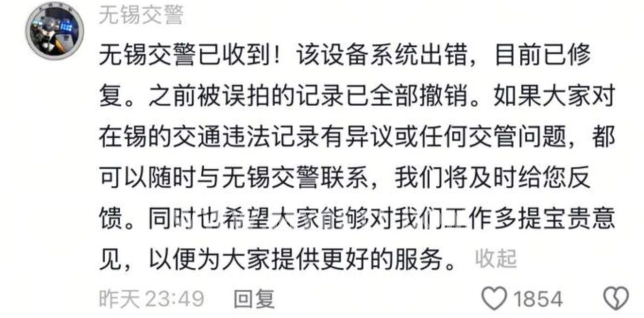 7月4日晚,无锡交警回应此事,称该设备系统出错,目前已修复,之前被误拍的记录已全部撤销。“如果大家对在无锡的交通违法记录有异议或者任何交管问题,都可以随时与无锡交警联系,我们将及时给您反馈。同时也希望大家能够对我们工作多提宝贵意见,以便为大家提供更好的服务。”