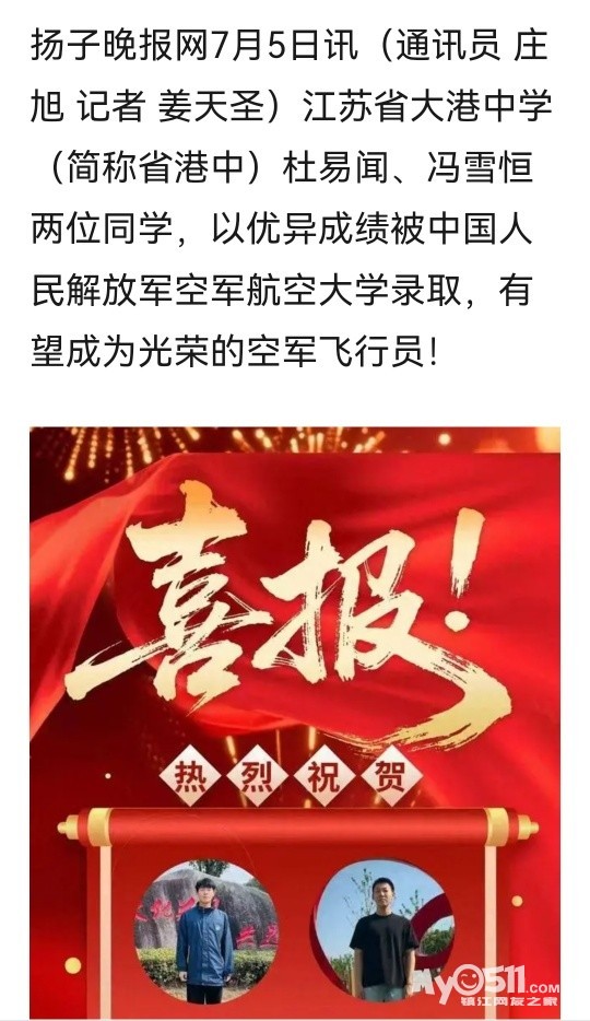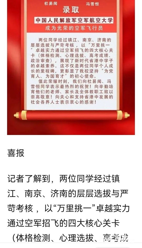 祝贺!江苏省大港中学两同学,被中国人民解放军空军航空大学录取
