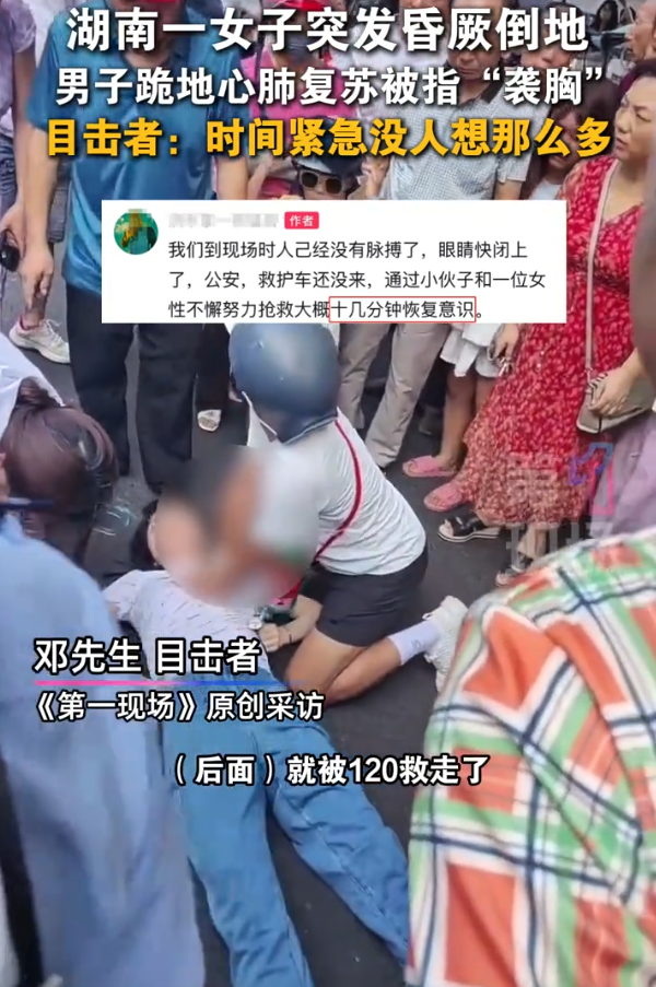 后来实在没力气了,还有个穿紫裙子的姑娘接替他继续按。就这么坚持了十几分钟,直到救护车来。根据视频拍摄者描述,当时现场根本没人想这些,幸亏他出手及时,昏倒的女士后来眼皮能动了
