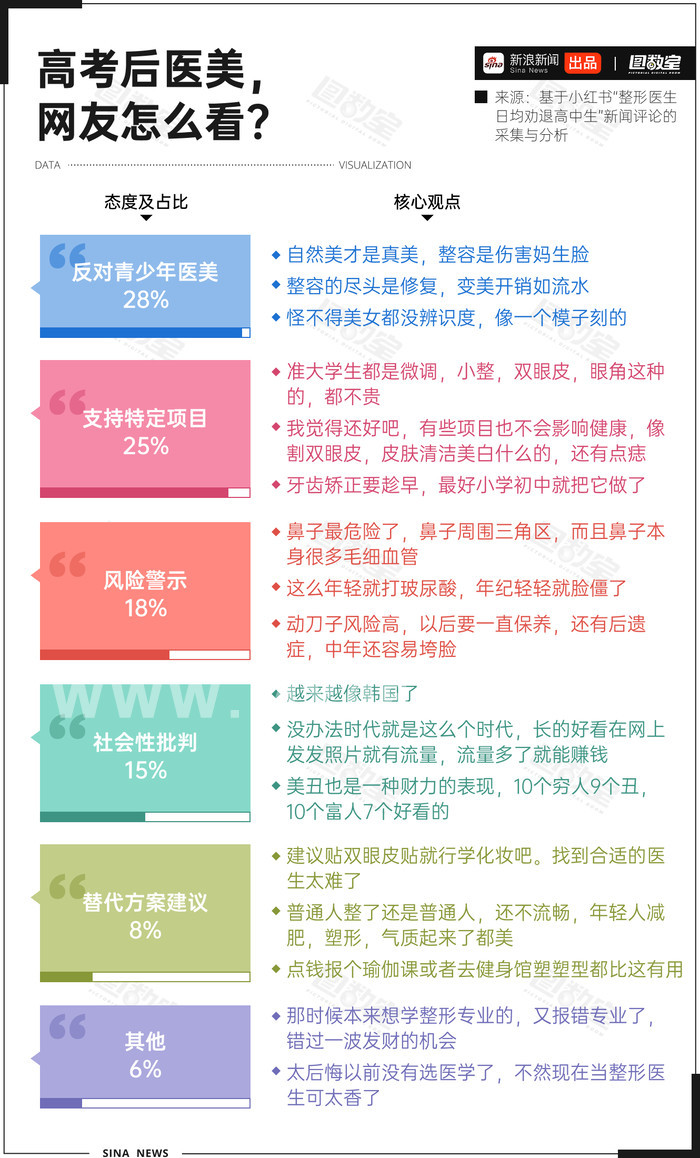 图数室对社交平台上“整形医生日均劝退高中生”新闻评论进行采集分析,结果显示,近三成网友明确反对青少年医美,认为“妈生脸最为珍贵”;当然也有25%的网友支持某些特定的微调项目,如双眼皮手术、点痣、牙齿矫正等,有人还会以过来人的身份传授术后的调养经验;还有8%的网友努力寻求“美丽与开刀”之间的平衡,提出可以通过后期化妆、健身等方式提升个人魅力。