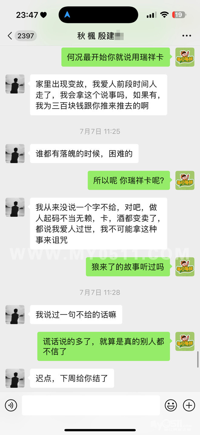 一开始说司机先拿走,晚上拍瑞祥卡给我结账,到无数次的推脱找理由找借口,9张图只是朋友圈的极限,并不是他借口的极限