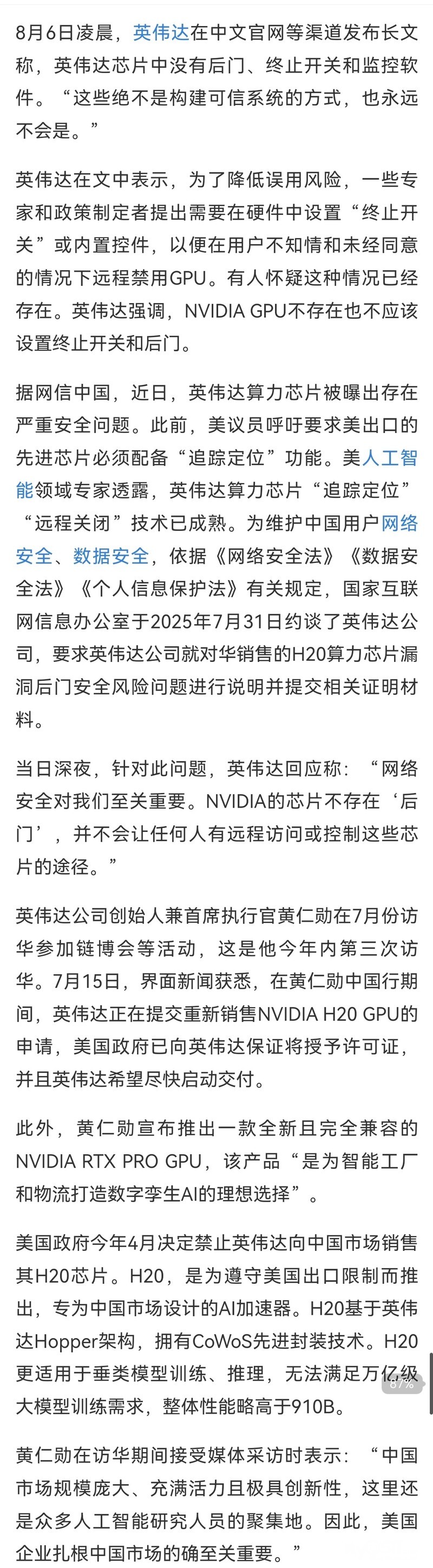 英伟达深夜发文回应芯片“后门”问题