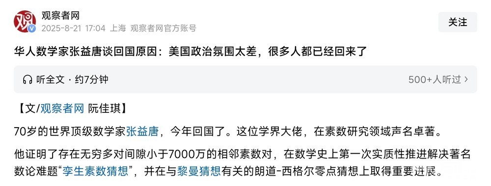 华人数学家张益唐谈回国原因:美国氛围太差,很多人都已经回来了