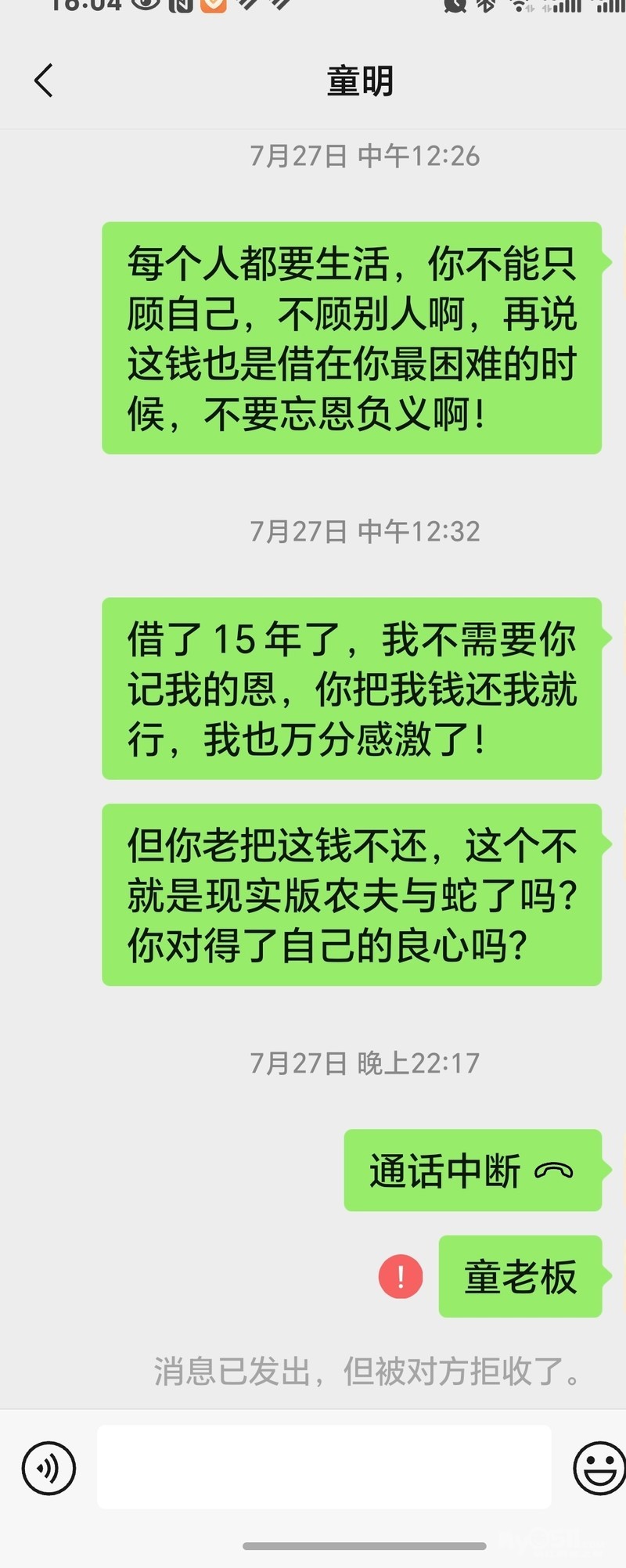 我21年5月份,借了15000给朋友,说是一周时间给我,每次找它,各种理由推脱,真的可以写一篇长篇小说了,真佩服这些狗日的老赖的口才,拖了快3年了才给我,就每次200或者300给我,像羊子拉屎一样,每次拉一点,去年终于还清了,果断删除了!