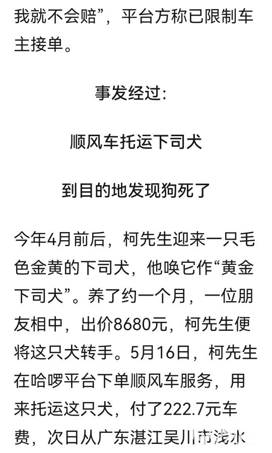 » 700公里托运“黄金下司犬”,死在顺风车后备箱!狗主人索赔9000元,谁该担责?