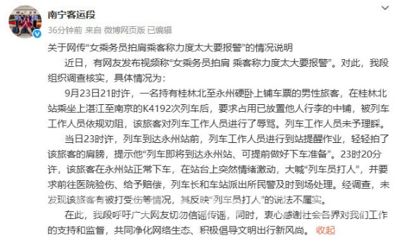 今天,中国铁路南宁局集团有限公司南宁客运段官微@南宁客运段 发布关于网传“女乘务员拍肩乘客称力度太大要报警”的情况说明——