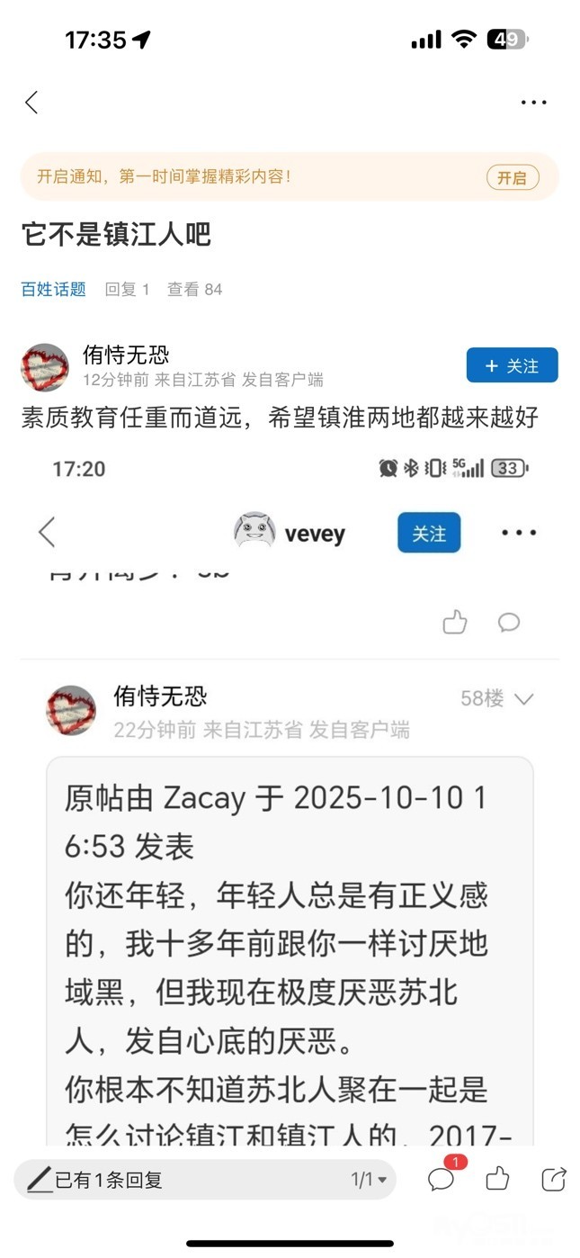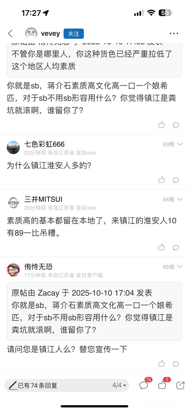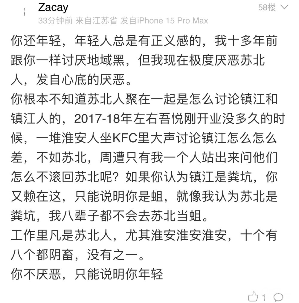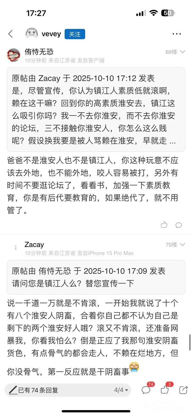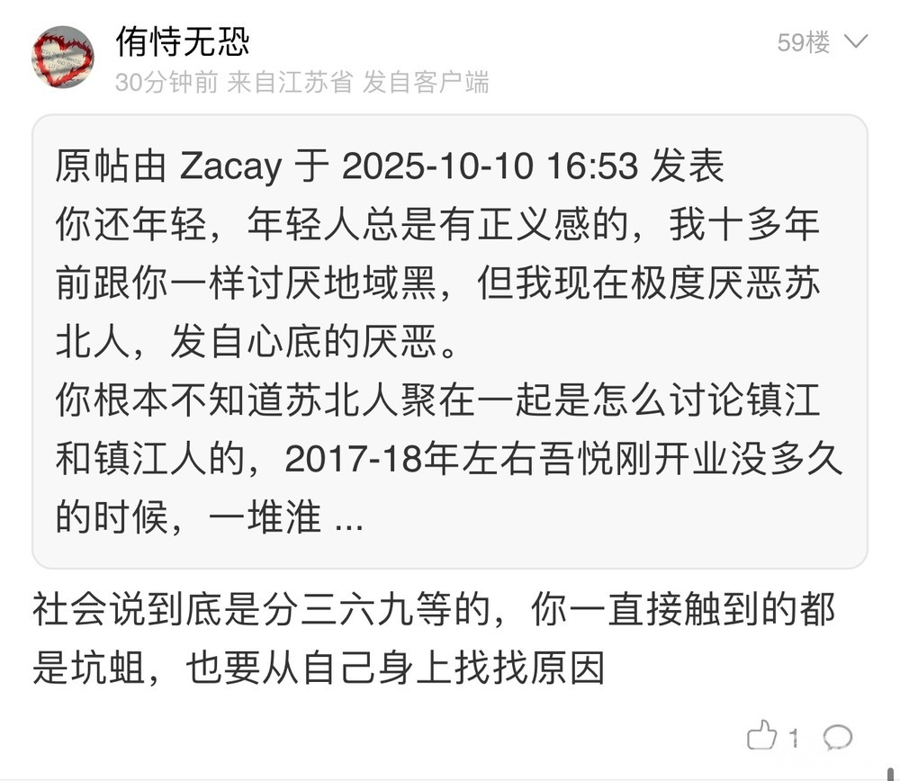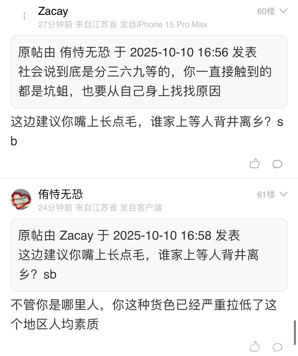 大男人对喷的第一反应不是堂堂正正的互喷,也不是潇洒的离开镇江,再不济也不是留电话线下决斗。而是干阴畜事开帖网暴我(本帖20分钟之前发的),不是正应了我那句“十个有八个淮安人都阴畜吗?”