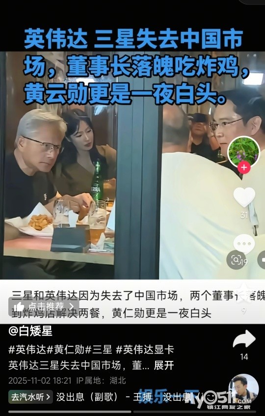三星和英伟达失去中国市场,两董事长落魄的吃炸鸡了。黄仁勋更是一夜白头。说明他们现有还没有老命头子我干车钳铣一个月工资1万多幸福呢