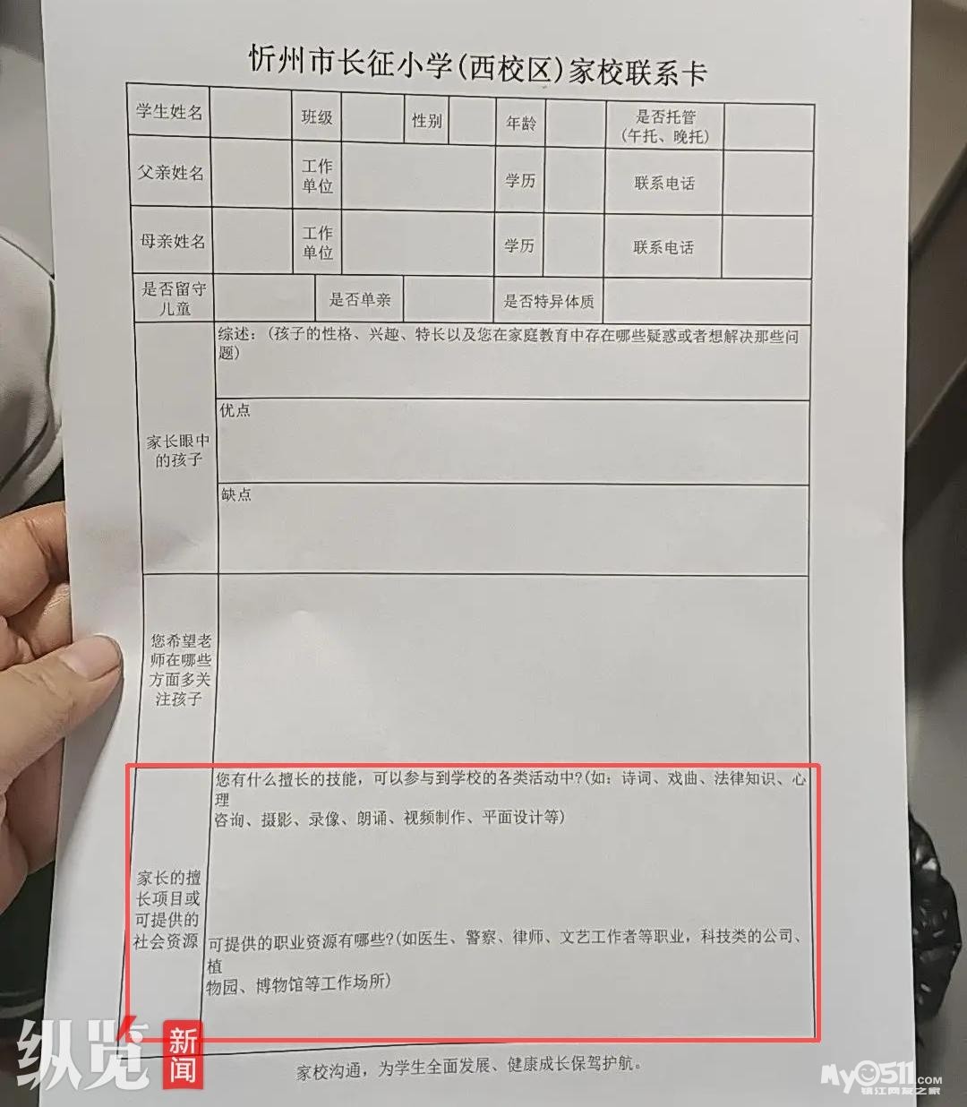 据纵览新闻此前报道,有网友晒出一张图片,显示是一张名为“忻州市长征小学(西校区)家校联系卡”的表格,表格其中一栏要求填写“家长的擅长项目或可提供的社会资源”引发争议。多名网友发布相同表格证实,确实收到了这样一张表格,感觉有些不合适。