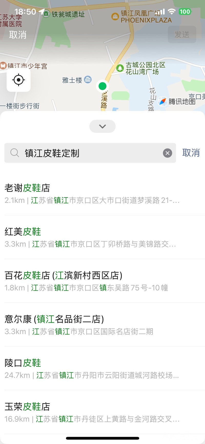 楼主,教你一个办法,在微信聊天窗口的输入框右侧点+,弹出菜单后点“位置”,在位置的输入窗口输入“镇江皮鞋定制”,会弹出很多店家,选择靠你家最近的即可。