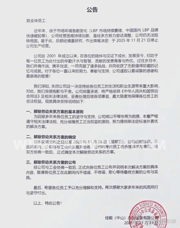 已于2025年11月24日宣布将于2025年11月21日正式停止生产经营,主要原因是激光打印机市场萎缩及国内品牌竞争加剧,公司承诺依法给予员工经济补偿。