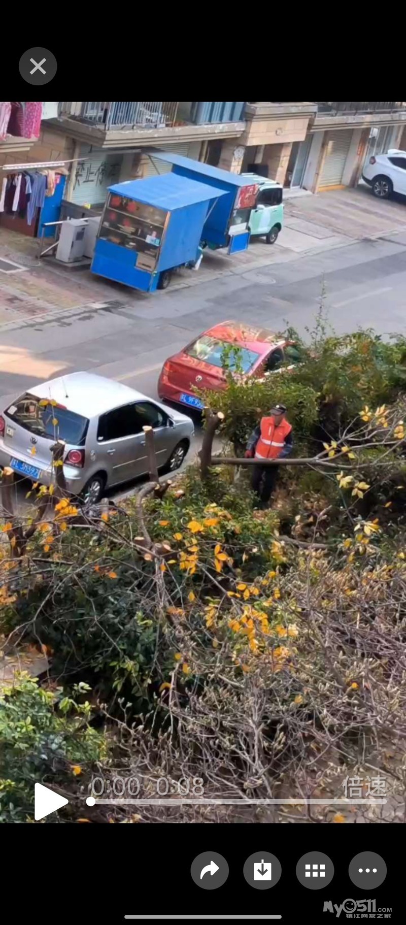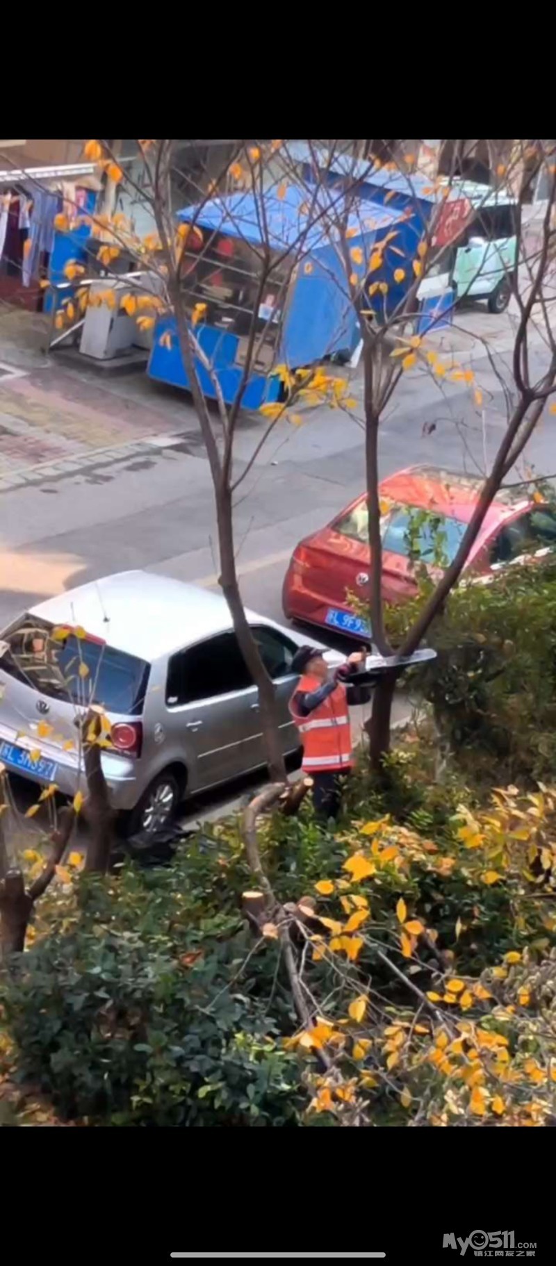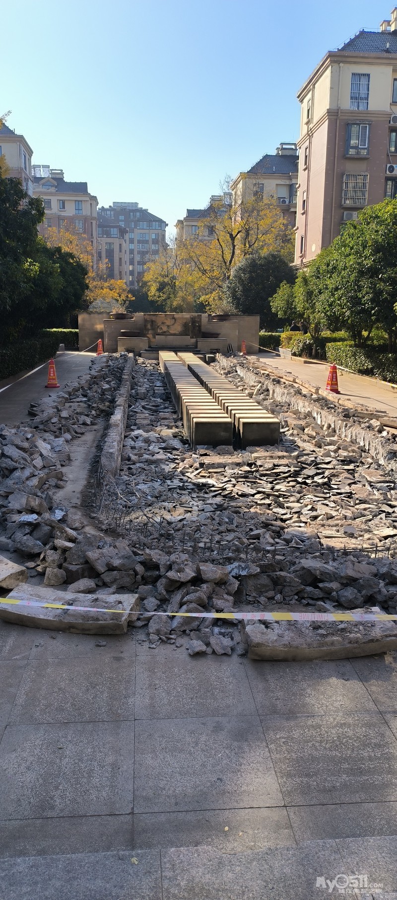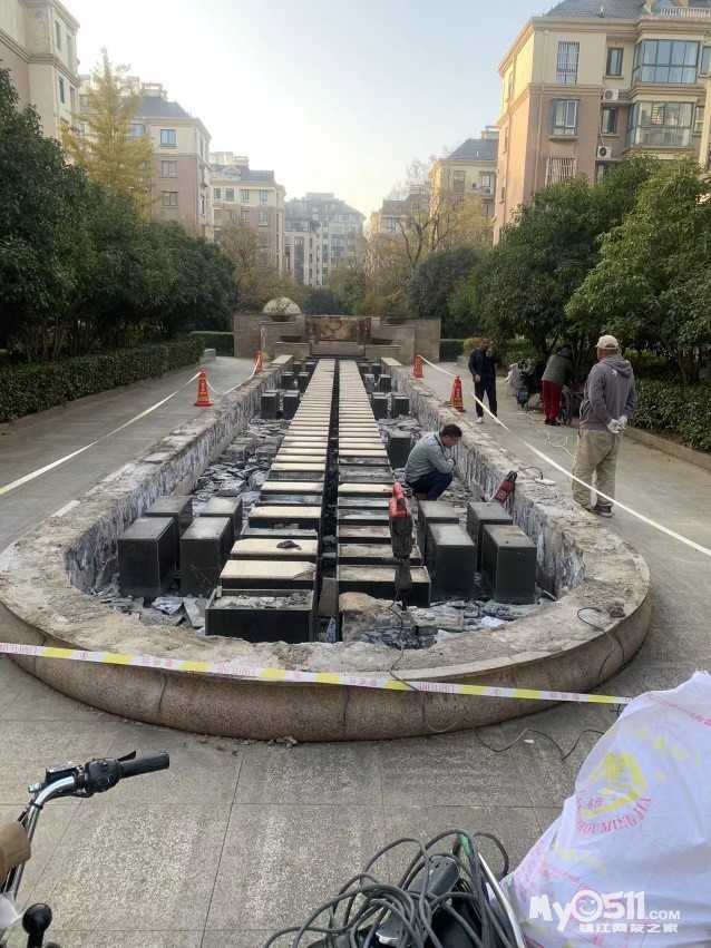 丹徒新区欢喜家园中心景观喷泉池被物业强行拆除,十几年的绿化树木被锯成桩,业主权益谁来维护