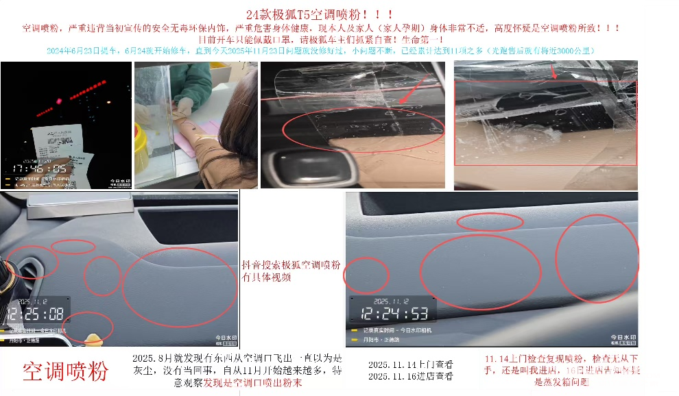 一年多来只要有空就是往售后跑。以为主驾座椅维修好后就可以安心的结束这不愉快的修车之路。没想到在25年11月初发现空调严重喷粉,达到肉眼可见程度,因本人对粉尘过敏,灰尘一大就容易喘不上气,(其实本人在8月份就有发现,但起初以为是灰尘没有多想)随后拨打400反馈。