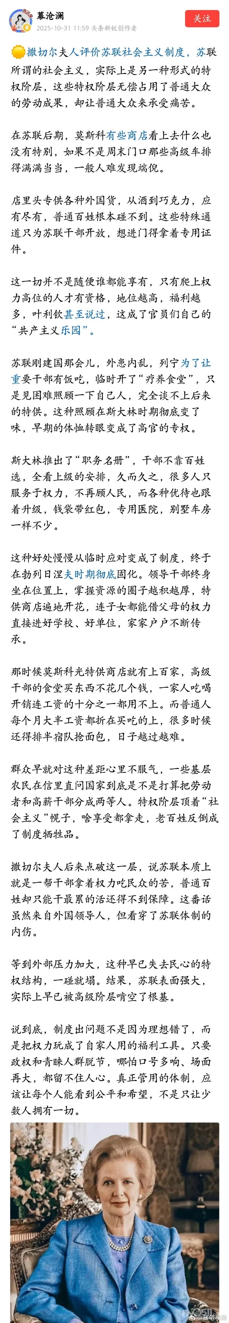 撒切尔夫人当年这样评价苏联的制度。