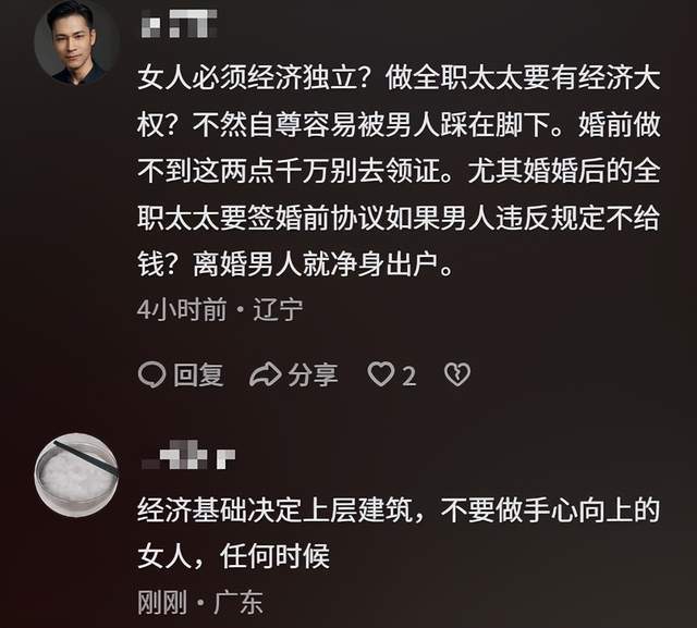 有人说,这就是为什么如今越来越多女性不肯回归家庭的原因。不是不愿意付出,而是在长期的失衡关系里,很多人的付出变成了理所当然,甚至变成了“你什么都靠我,还想要什么”的资本。