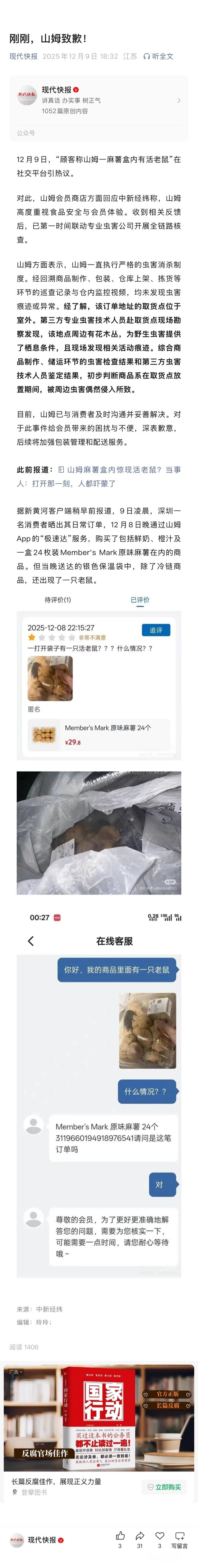 12月9日,“顾客称山姆一麻薯盒内有活老鼠”在社交平台引热议。对此,山姆会员商店方面回应中新经纬称,山姆高度重视食品安全与会员体验。收到相关反馈后,已第一时间联动专业虫害公司开展全链路核查。山姆方面表示,山姆一直执行严格的虫害消杀制度。经回溯商品制作、包装、仓库上架、拣货等环节的巡查记录与仓内监控视频,均未发现虫害痕迹或异常。经了解,该订单地址的取货点位于室外。第三方专业虫害技术人员赴取货点现场勘察发现,该地点周边有花木丛,为野生虫害提供了栖息条件,且现场发现相关活动痕迹。综合商品制作、储运环节的虫害检查结果和第三方虫害技术人员鉴定结果,初步判断商品系在取货点放置期间,被周边虫害偶然侵入所致。目前,山姆已与消费者及时沟通并妥善解决。对于此事件给会员带来的困扰与不便,深表歉意,后续将加强包装管理和配送服务。