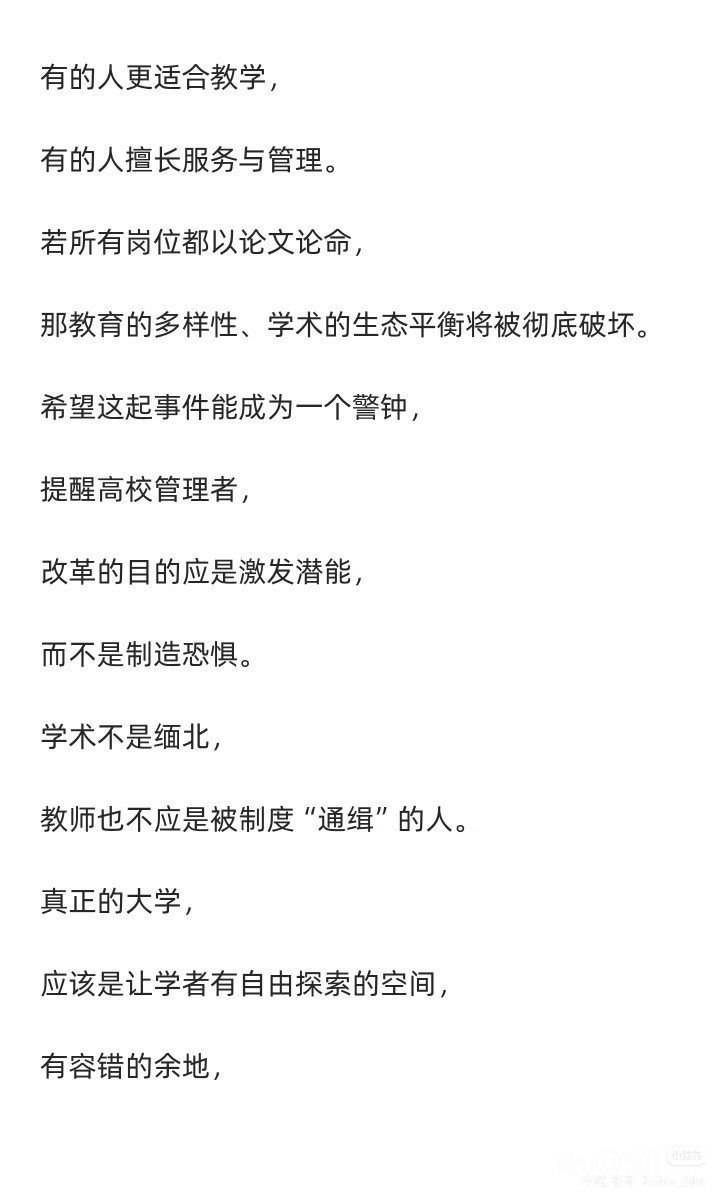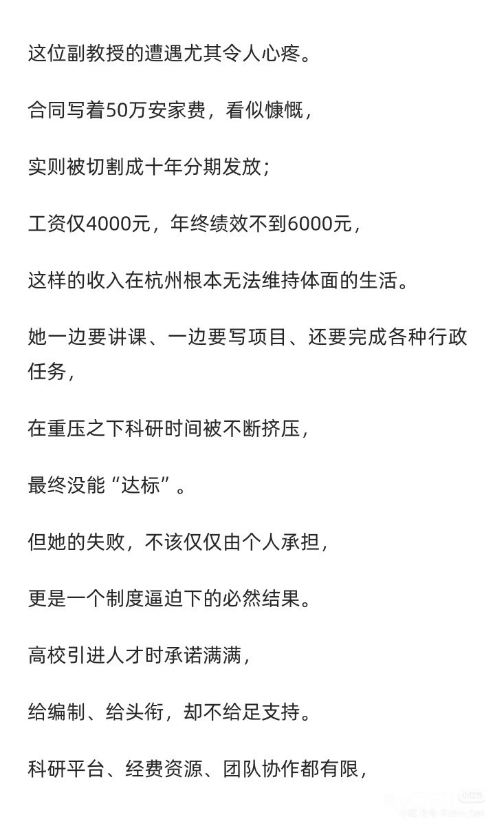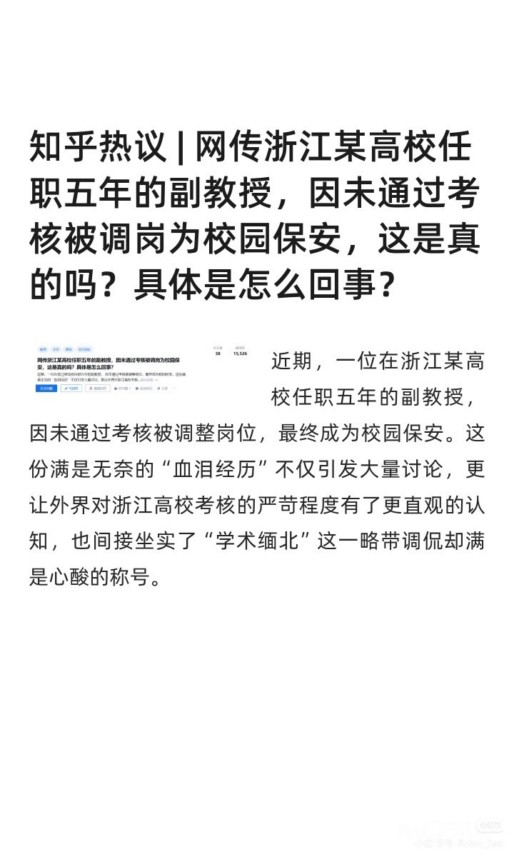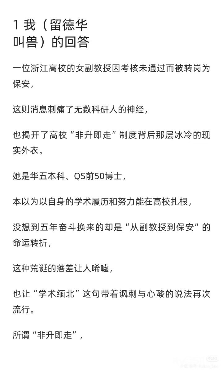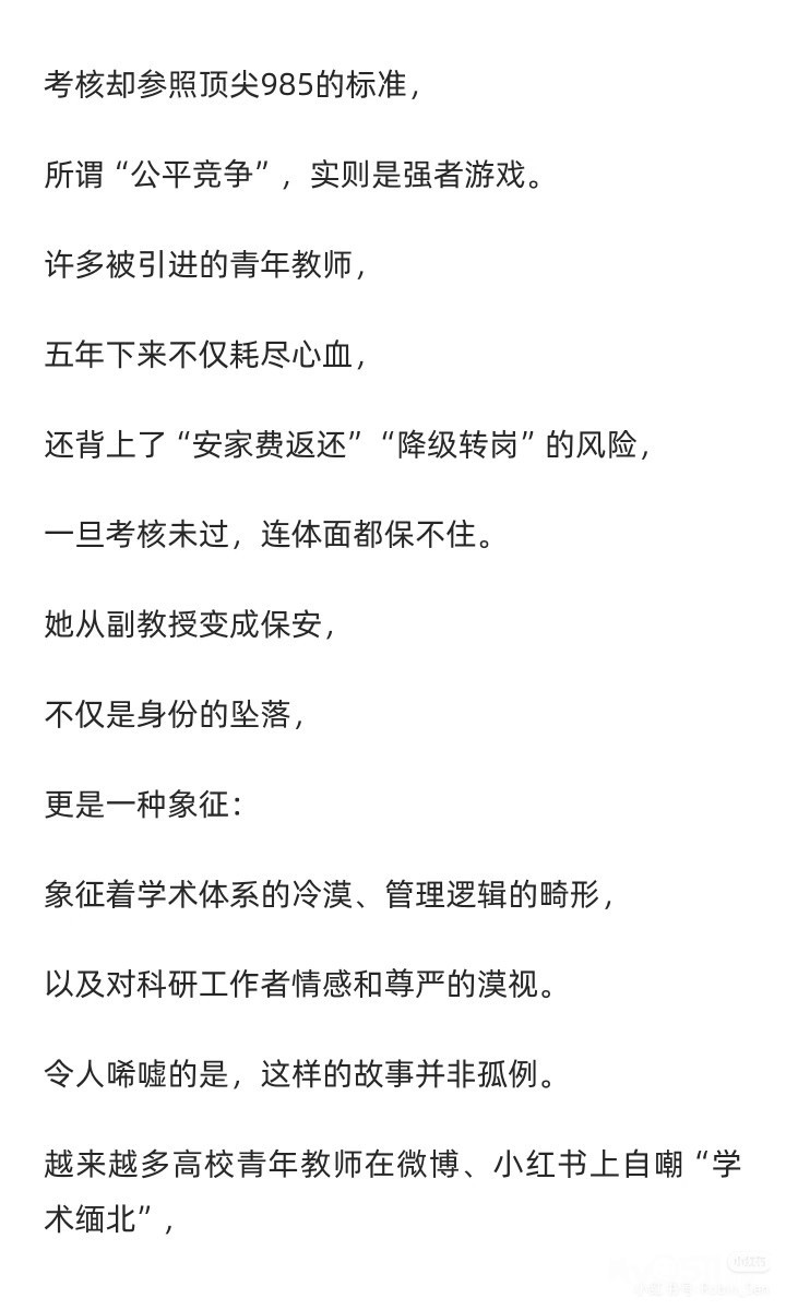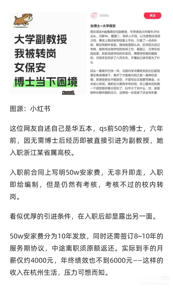 前情回顾[向右R]我之前在某高校任副教授,年终绩效大约每年6k出头,月薪4k。后来被转岗去做学校的安保工作,日常在校园巡逻,赶赶闯进学校的外卖员,喂喂学校里的猫啥的,月到手多了800,一直不懂自己读书是为了什么。最近很多转载我的经历,之所以道歉,是前夫哥还在为了考核焦头烂额,学校施压说我影响他年底6k的绩效。一开始,学校要我道歉的时候不要加上校名,我想了想反正这边高校都是一滩烂泥,加不加名字也都无关紧要。结果他们看我答应爽快,又嘀嘀咕咕,问我能不能放个兄弟院校的名字,给我当场气笑