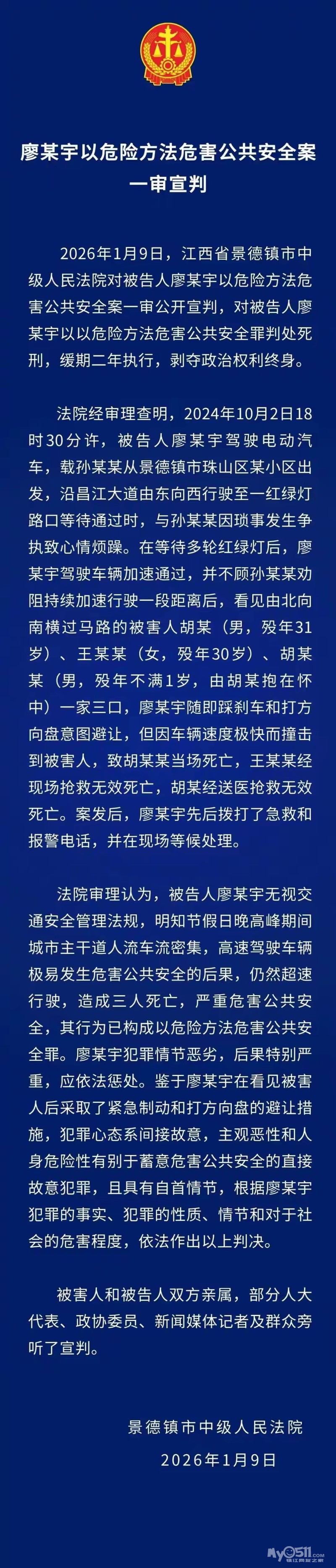 » 景德镇一家三口被撞案一审宣判 肇事司机廖新宇被判处死缓