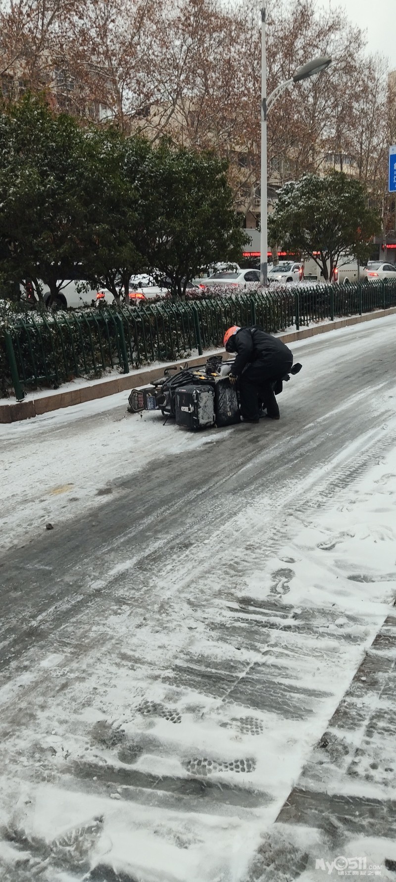 刚从东吴路锅圈取外卖出来,左右两个电瓶车同时摔倒