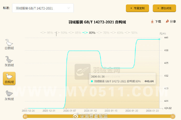 然而,羽绒服成本受填充物种类、绒子含量、蓬松度及面料设计等多重因素影响。例如填充物绒子含量高达90%的鹅绒,相比绒子含量80%的鸭绒,前者成本更高。山姆RR女士长款羽绒服使用的绒子含量80%白鸭绒,1月26日的价格为440.64元/kg。若以此计算,山姆499元羽绒服L码的充绒量为421克,鸭绒成本达440.64元*0.421约为185.51元。当然,这只是以1月26日的羽绒价格进行折算得出的成本价,只供消费者参考,并不代表山姆制造商的实际采购价格。需要再次强调的是,羽绒服的成本不仅与内部填充的羽绒有关,和用料、设计、款式等也有关。