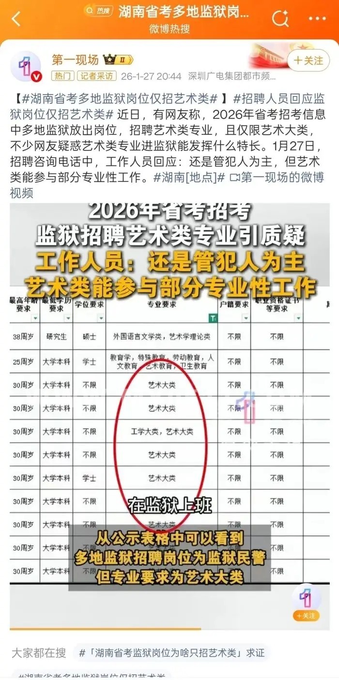 百姓话题  >  [资讯速递] 湖南省考多地监狱岗位招考仅限艺术大类引质疑 官方回应