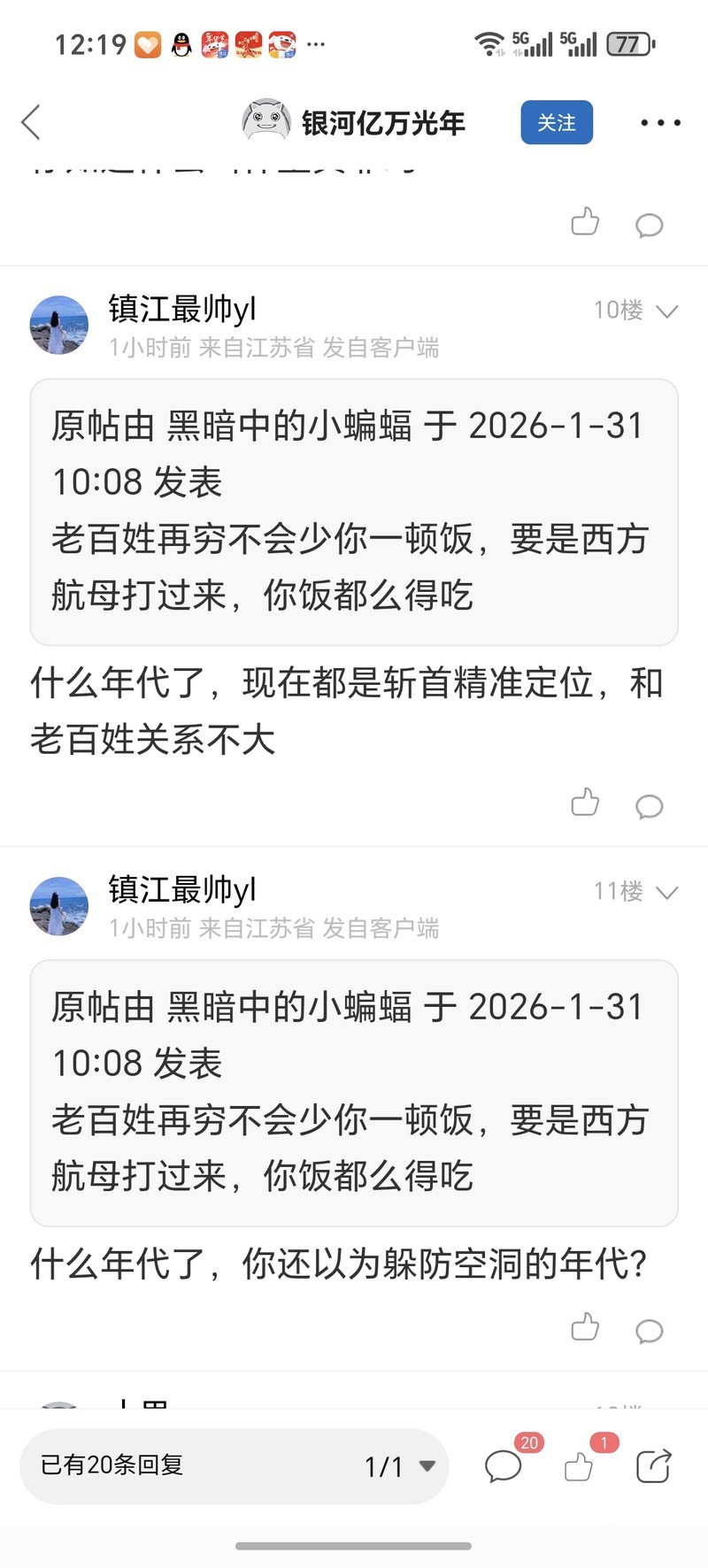 ,还和普通人关系不大,这人绝对是个大聪明,如果战争在我国国土,到时候要饿死很多人,还有人被人抢劫杀人强奸,到时候没人给你伸张正义,镇江最帅yi,真是个大聪明,这位网友有本事去乌克兰东部,你去报个警看有没有人来救你, 别指望美国人养你,他们自己内部流浪汉的问题都没解决,你算个啥!