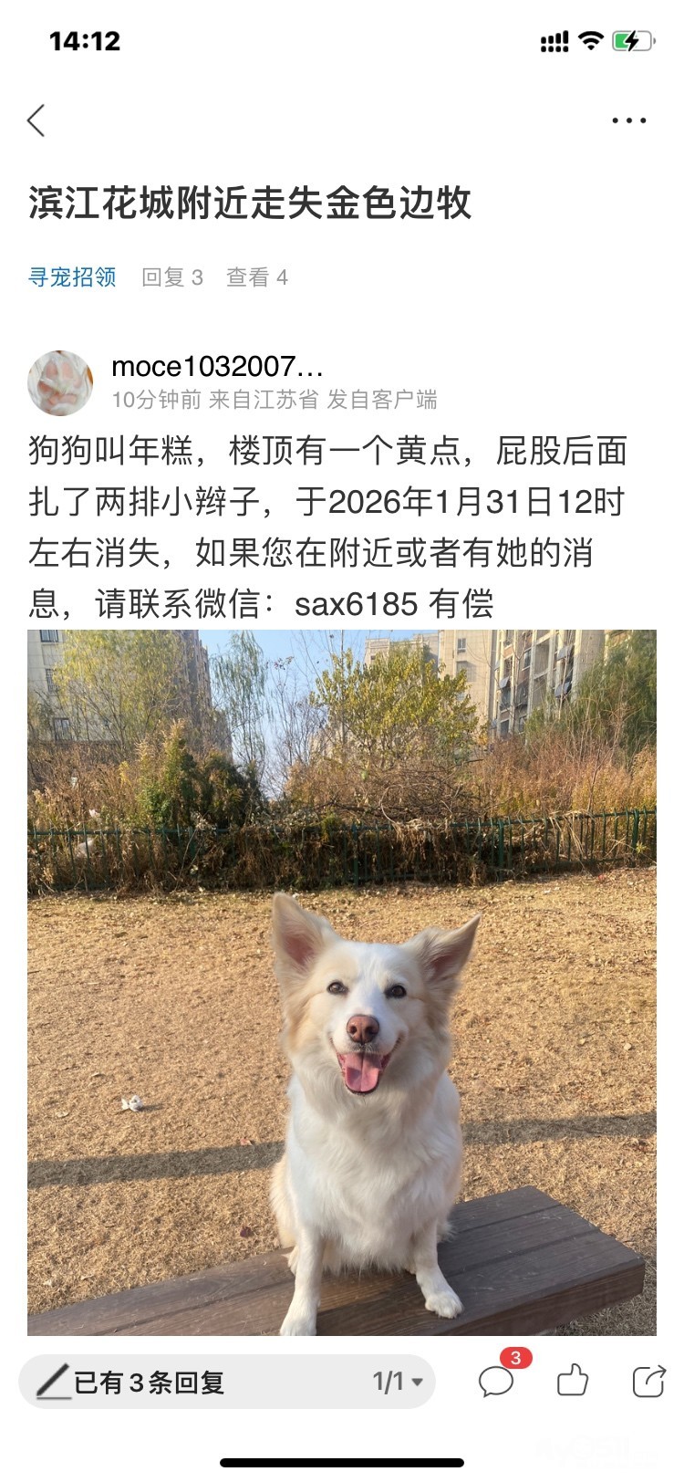狗狗叫年糕,楼头有一个黄点,屁股后面扎了两排小辫子,于2026年1月31日12时左右消失,如果您在附近或者有她的消息,请联系微信:sax6185 有偿