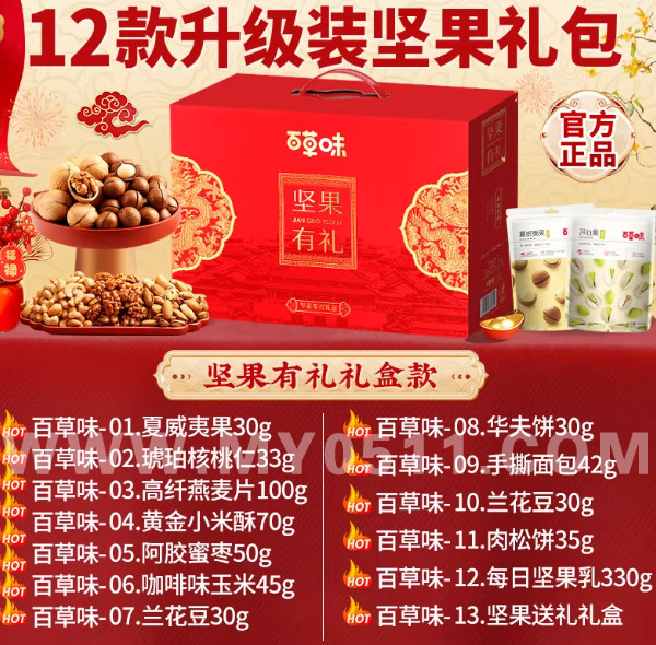 看了百草味、洽洽的一些礼盒,里面是各种的小零食和口感一般的饮品,重量是挺重的,但是里面正经的坚果是少的可怜,想买个纯坚果的还要仔细看核对克数,不然拿回来真的是让人很“惊喜”。