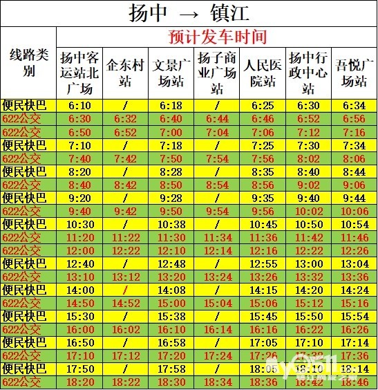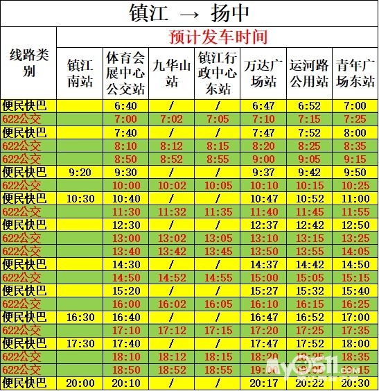二、622公交发车时间:扬中首站(扬中汽车客运站北广场):6:30、6:50、7:40、8:40、9:40、11:20、12:00、13:10、14:50、16:00、17:10、18:20镇江首站(体育会展中心):7:00、8:10、8:50、10:00、11:30、13:00、13:40、14:50、16:00、17:10、18:10、18:50三、运营调整执行时间:2026年2月10日开始执行