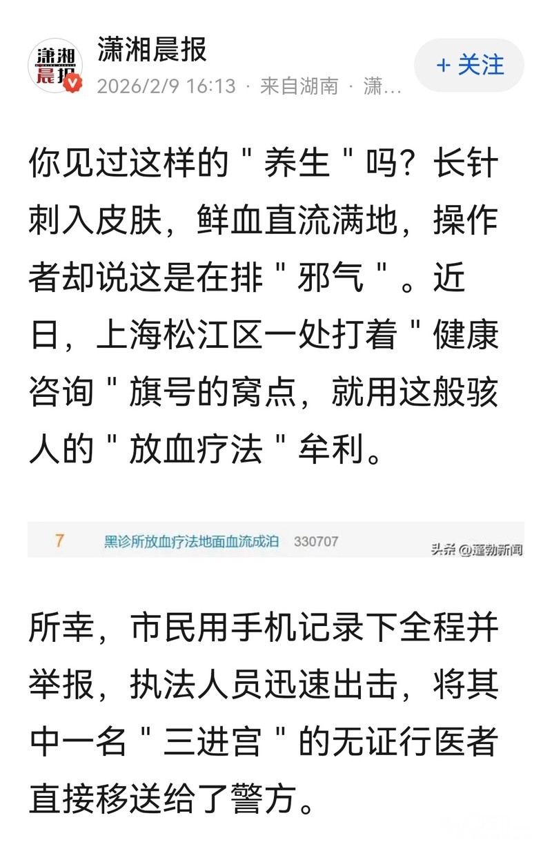 放血疗法很正常,非法行医就讲非法行医的事情好了,不要讲什么骇人不骇人的,那医院开刀做手术还更恐怖呢