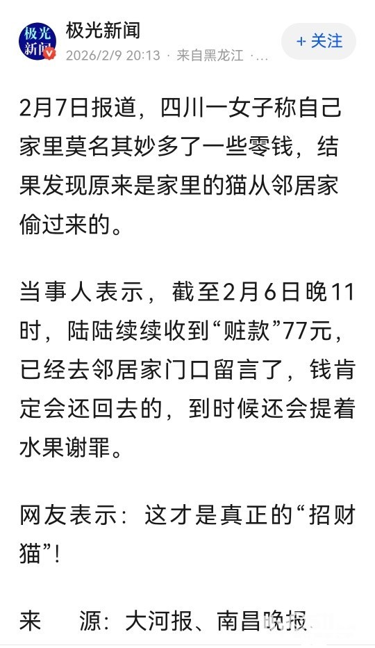 » 女子家莫名其妙出现很多零钱,竟是猫从邻居家偷来的,当事人:陆续收到“赃款”77元