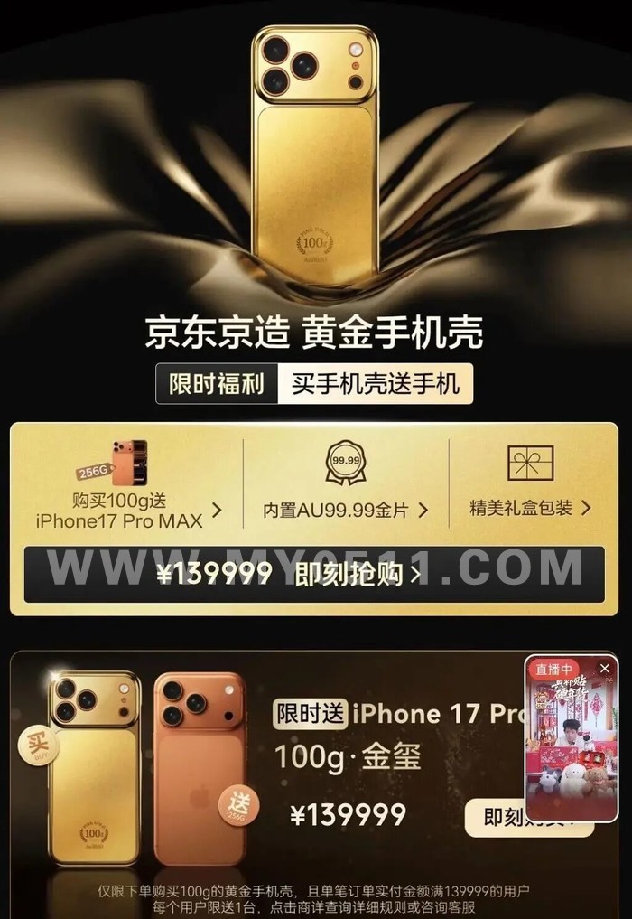 手机壳卖得比手机贵,如今竟已成现实!2月9日,有电商平台在春节前推出特色新品活动,买黄金手机壳,送一部iPhone 17 Pro Max。
