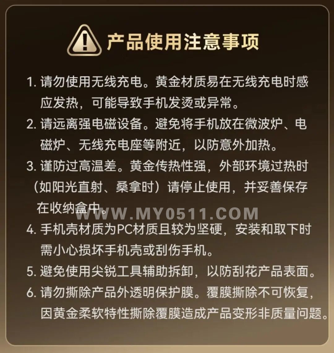 在该产品的使用注意事项中看到,商家特别提醒“请勿使用无线充电”,因黄金材质易在无线充电时感应发热,可能导致手机发烫或异常。