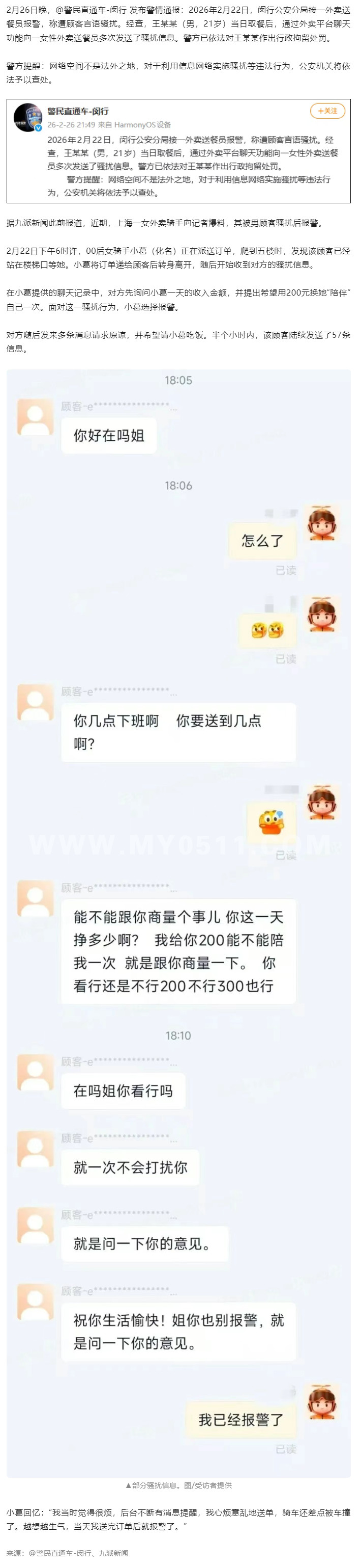 21岁王某某骚扰女外卖员,“半小时内发送57条信息”