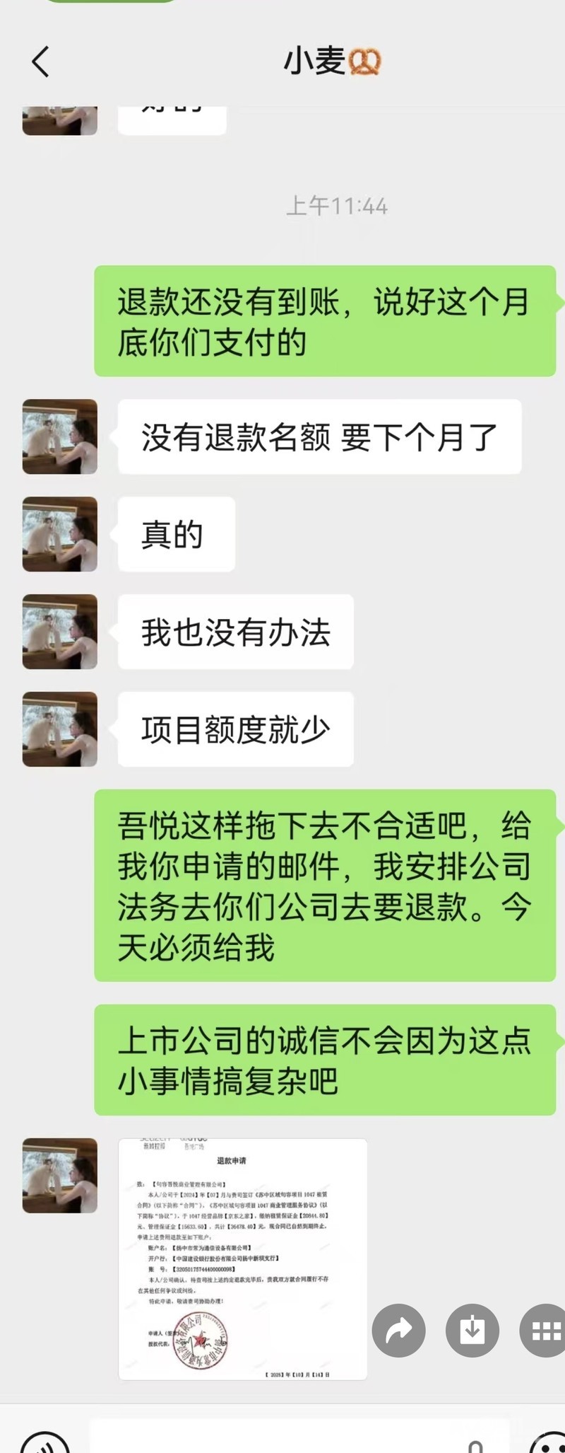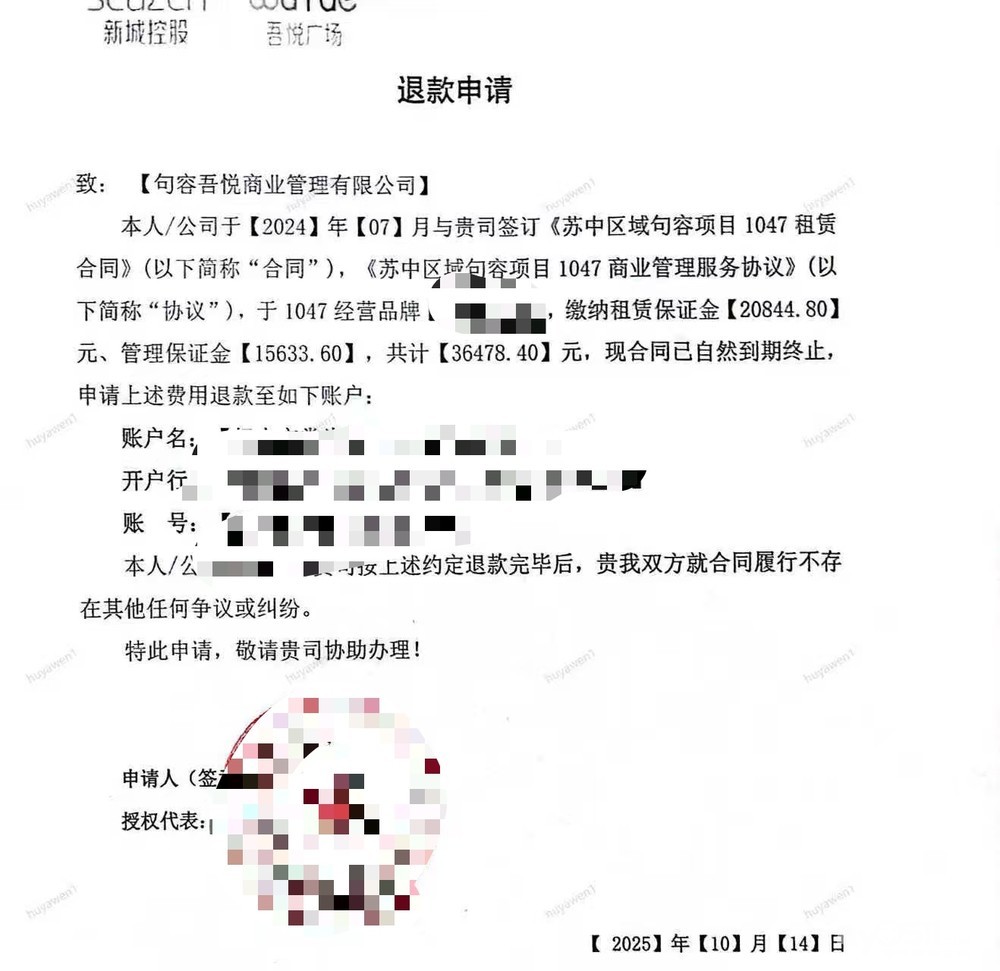 2024年7月份在句容吾悦广场内一楼租了一个商铺,由于生意不景气,一直亏损,经营了一年后,于25年7月底按吾悦要求撤场。按照当时租房合同约定,撤场三个月内就需要退还押金36478.4元。项目经理25年10给我们出具了退换函,截止到26年2月28日,押金仍未退回。