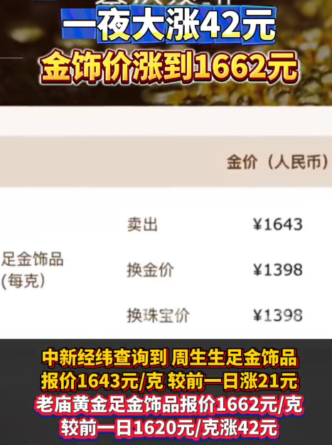 金饰价一夜大涨42块钱
