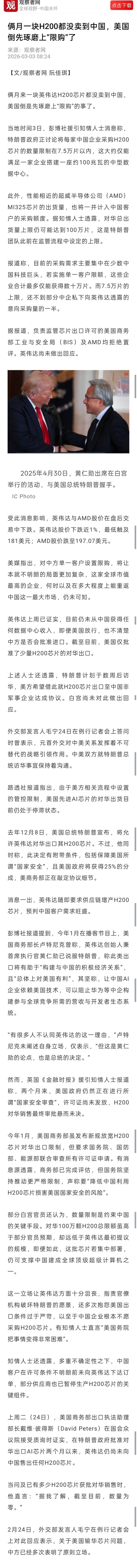 » 俩月一块H200都没卖到中国,美国倒先琢磨上“限购”了