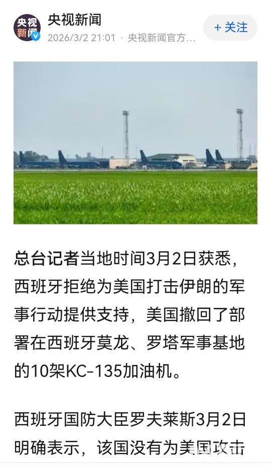 西班牙拒绝支持对伊行动,美撤走10架美军加油机