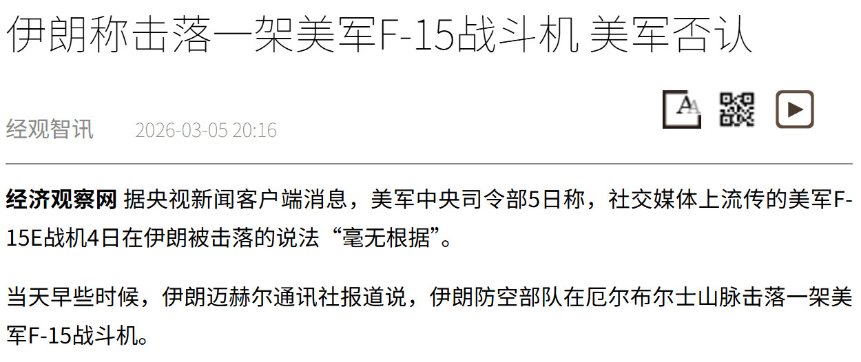 传美国中央司令部官员向媒体证实,昨天在伊朗西南部,一架美国空军 F-15E“攻击鹰”战斗机很可能是被伊朗防空系统击落的。飞行员在伊朗领空安全弹射,随后一支美以联合撤离小组成功进入伊朗,将飞行员接回。