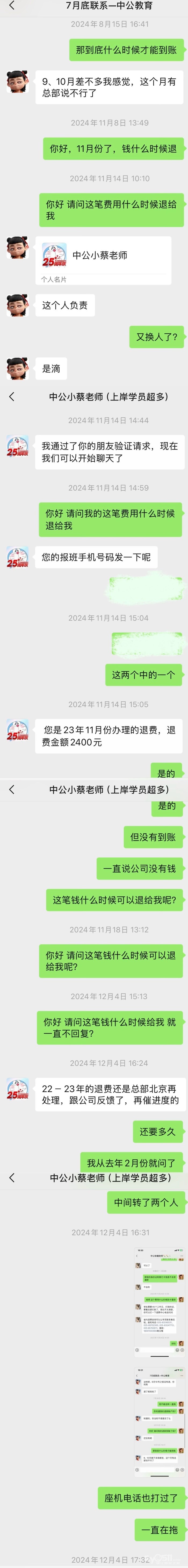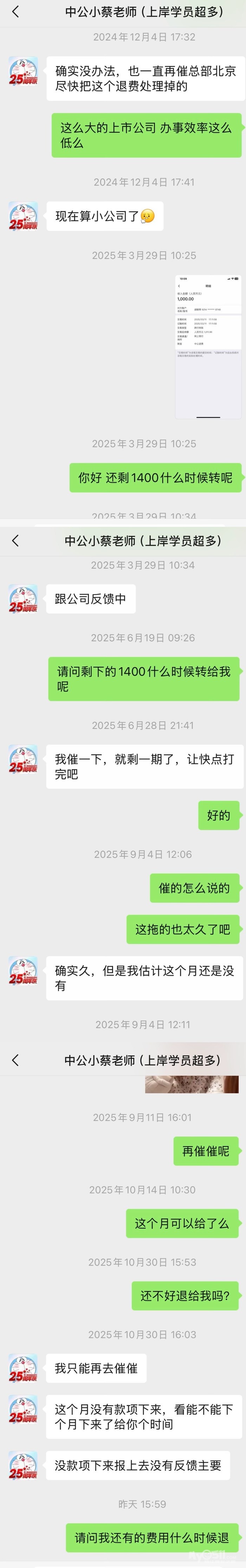 苏宁A座的中公教育一直拖欠费用,教育局电话打不少次了还是不给,2021年8月29日在中公报的教师资格证,如若没有考过,退我2400元,有效期到2023年8月29日,现在两年半过去了,就中途2025年3月29日退了1000元,现在还差我1400元,到现在了还不给我退给我,给我理由是:资金不足,两年半过去了还资金不足???骗谁呢